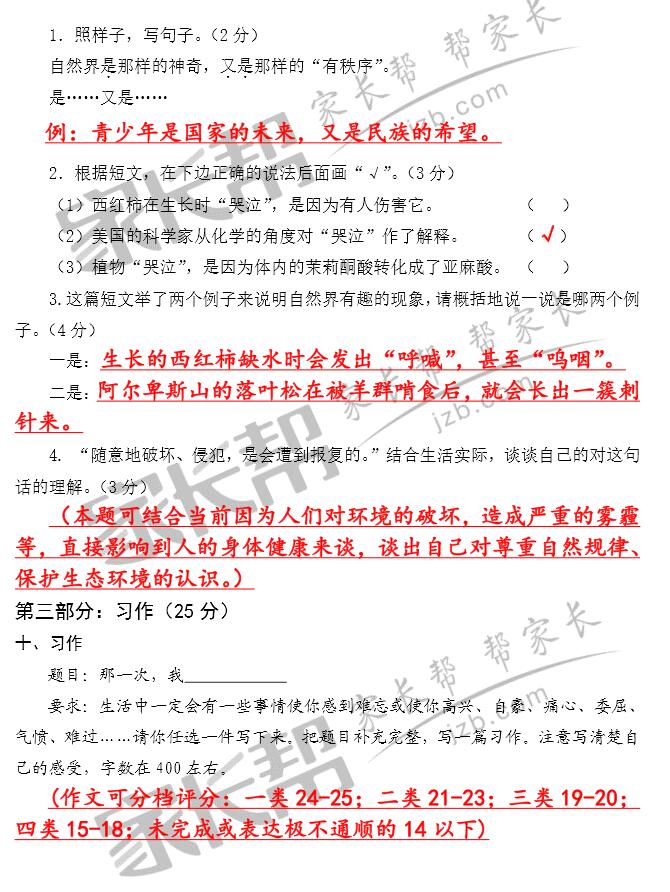 2016-2017学年上学期武汉东新区五年级语文期末试卷答案(5)