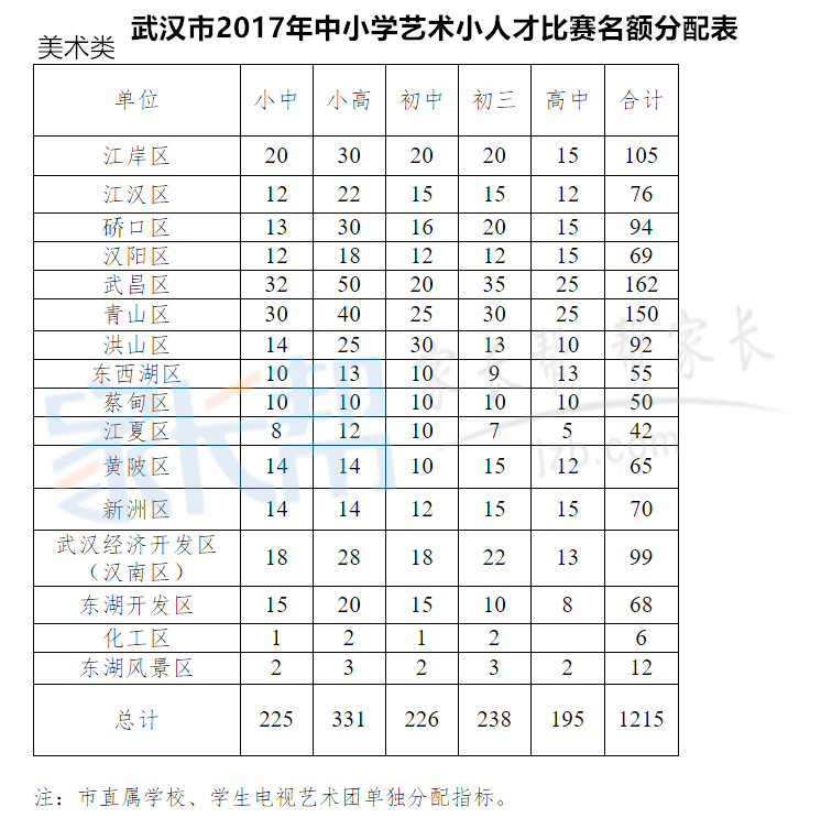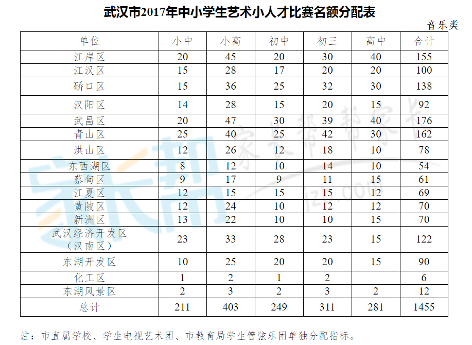 2017年武汉市艺术小人才比赛时间和各区名额确定