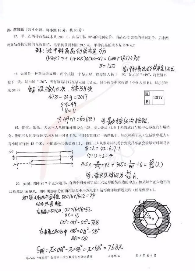 2017年武汉惟乐杯数学六年级A2卷真题及答案(4)