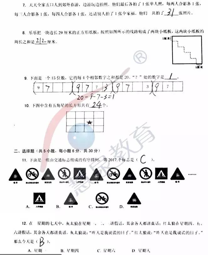 2017年武汉惟乐杯数学三年级A2卷真题及答案(2)