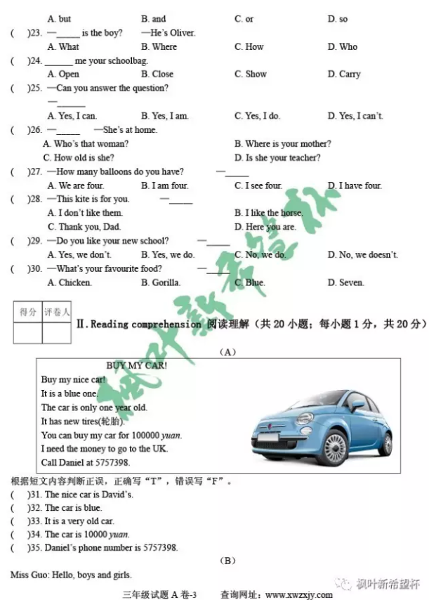 2017年武汉新希望杯英语三年级试卷(3)