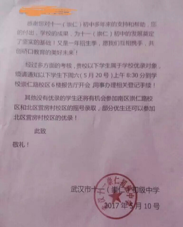 5月12日十一初崇仁正式开始区内优录了,11日晚上十一中拿到硚口区300强名单,300强名单是综合硚口区五六年级的大考成绩排出来的,12日下午硚口区各小学班主任老师陆续开始通知孩子家长优录的消息,并通知优录的家长5月20日到十一初南区面谈。恭喜优录的孩子和家长!