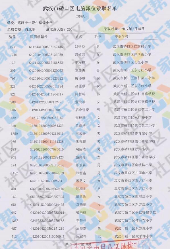 2017年武汉十一崇仁小升初摇号录取名单(9)