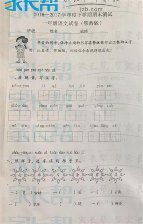 2016-2017武汉武昌区一年级下学期语文期末试卷