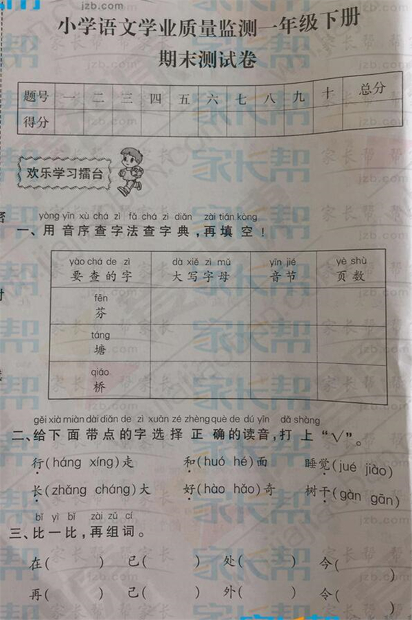 2016-2017武汉江汉区一年级下学期语文期末试卷