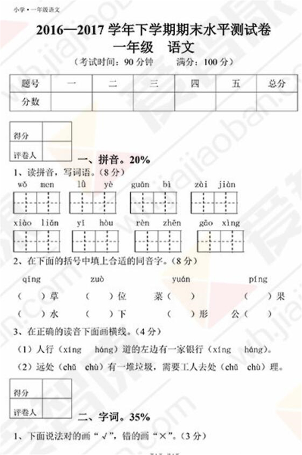 2016-2017武汉汉阳区一年级下学期语文期末试卷