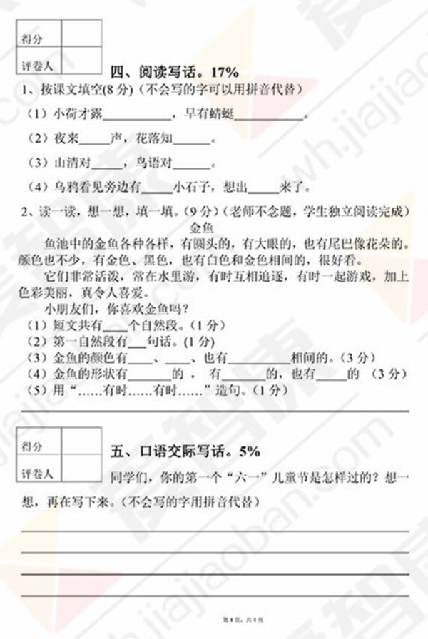 2016-2017武汉汉阳区一年级下学期语文期末试卷(4)