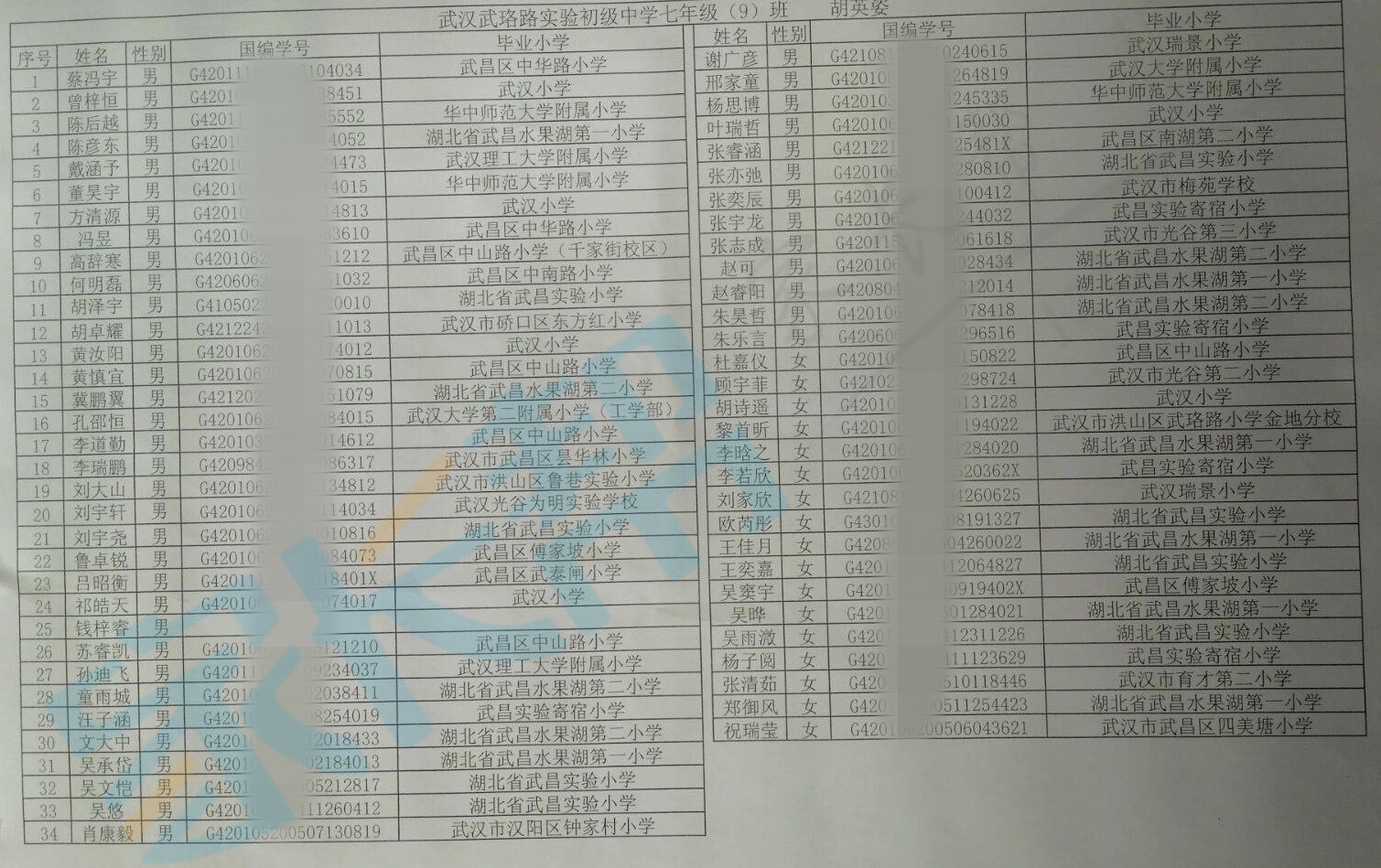 2017年武汉武珞路中学初一分班名单及班型(5)