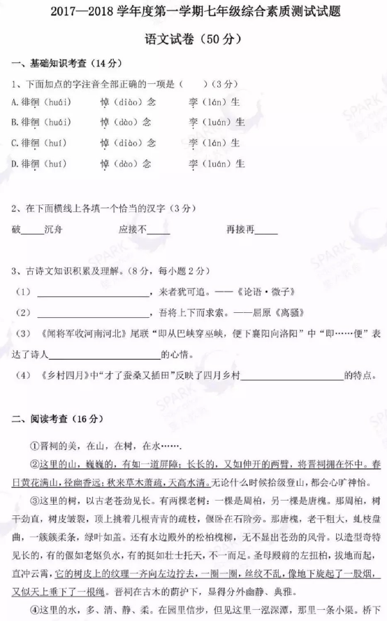 武汉江岸区2017年初一新生统考语文试卷及答案