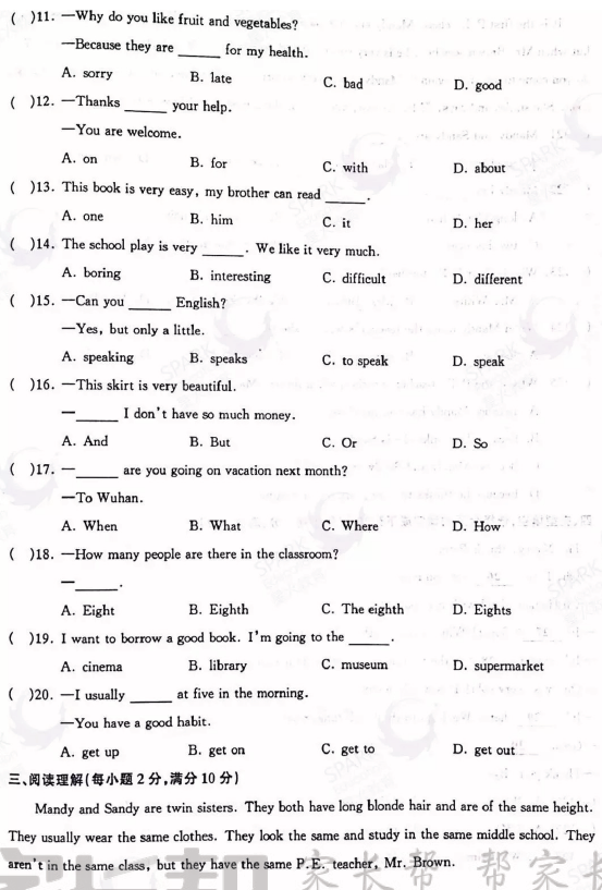 2017武汉江岸区初一新生统考英语试卷及答案(2)