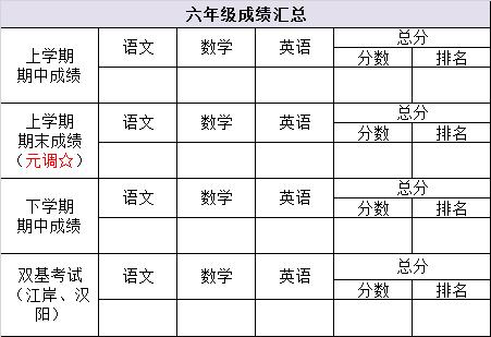 家长要帮孩子收集好六年级大型考试各科考试分数及排名,有条件的可以从五年级就开始准备。最好是将考试成绩绘制成表格(如下),因为名初优录时,这些数据都是你和名初“谈判”的条件。