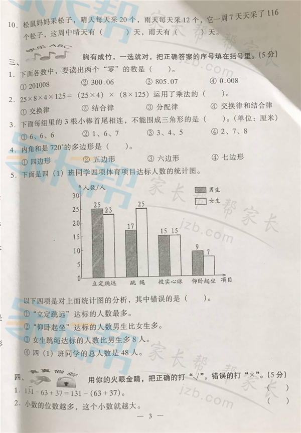 2016-2017武汉江岸区四年级下学期数学期末试卷(3)