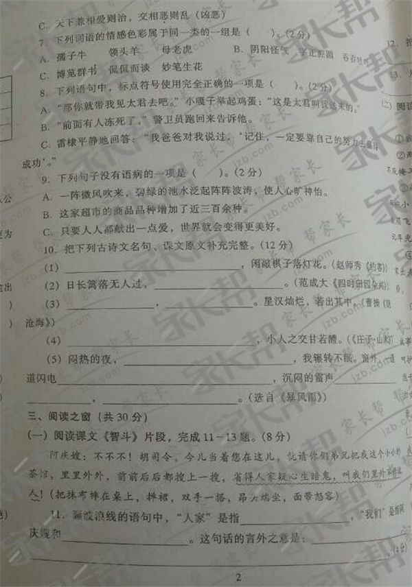 2016-2017武汉江岸区五年级下学期语文期末试卷(2)