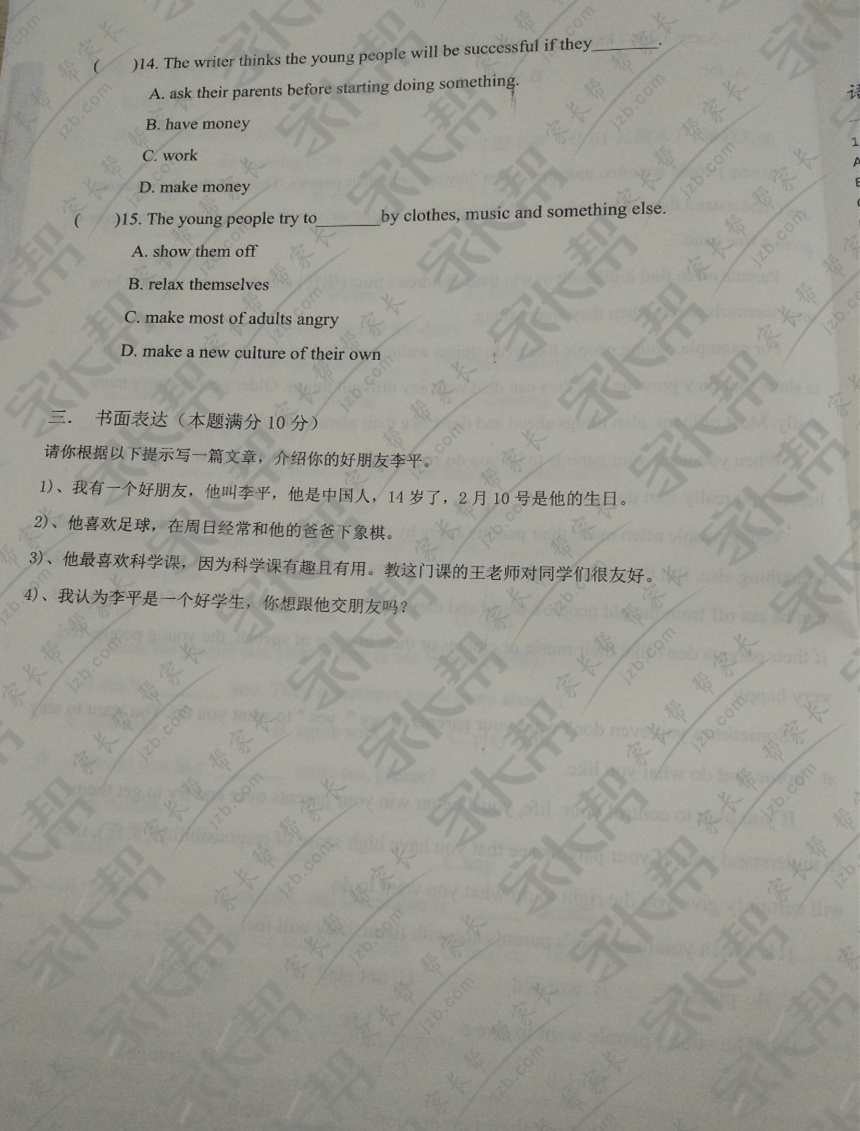 2017年武汉华一寄宿初一入学测试英语试卷(3)