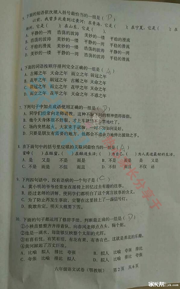 2018年武汉武昌区六年级语文期末试卷(鄂教版)(2)