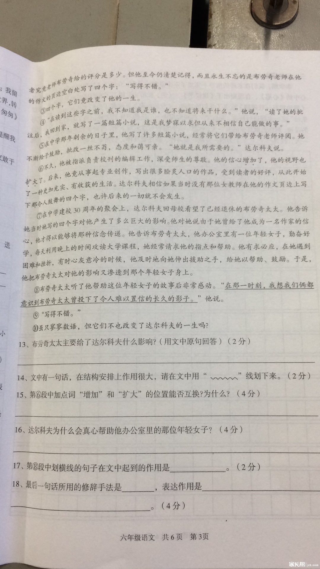 2018年武汉东西湖区六年级语文期末试卷(3)