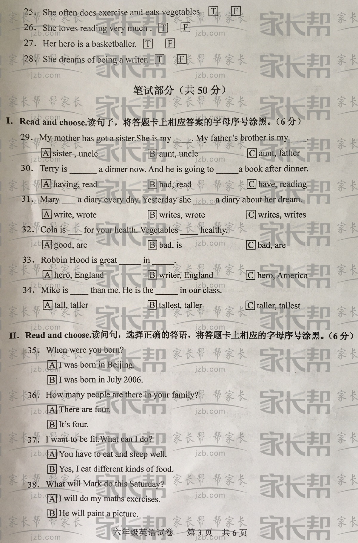 2018年武汉武昌区六年级英语毕业考试卷(3)