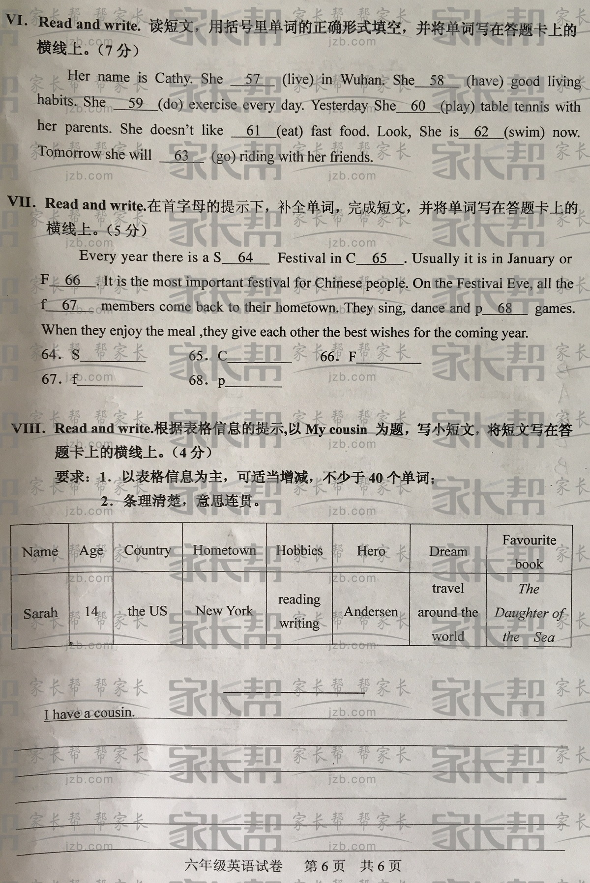 2018年武汉武昌区六年级英语毕业考试卷(6)