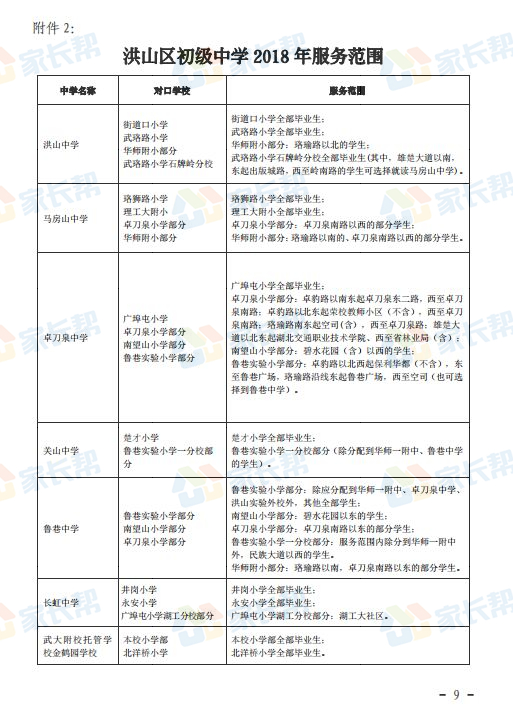 2018年武汉洪山区初中入学对口表