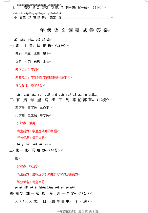 2019年武汉市小学语文一年级期末模拟卷四(图片版)(3)