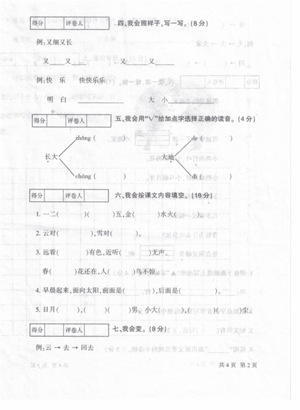 2019年武汉市小学语文一年级期末模拟卷五(图片版)(2)