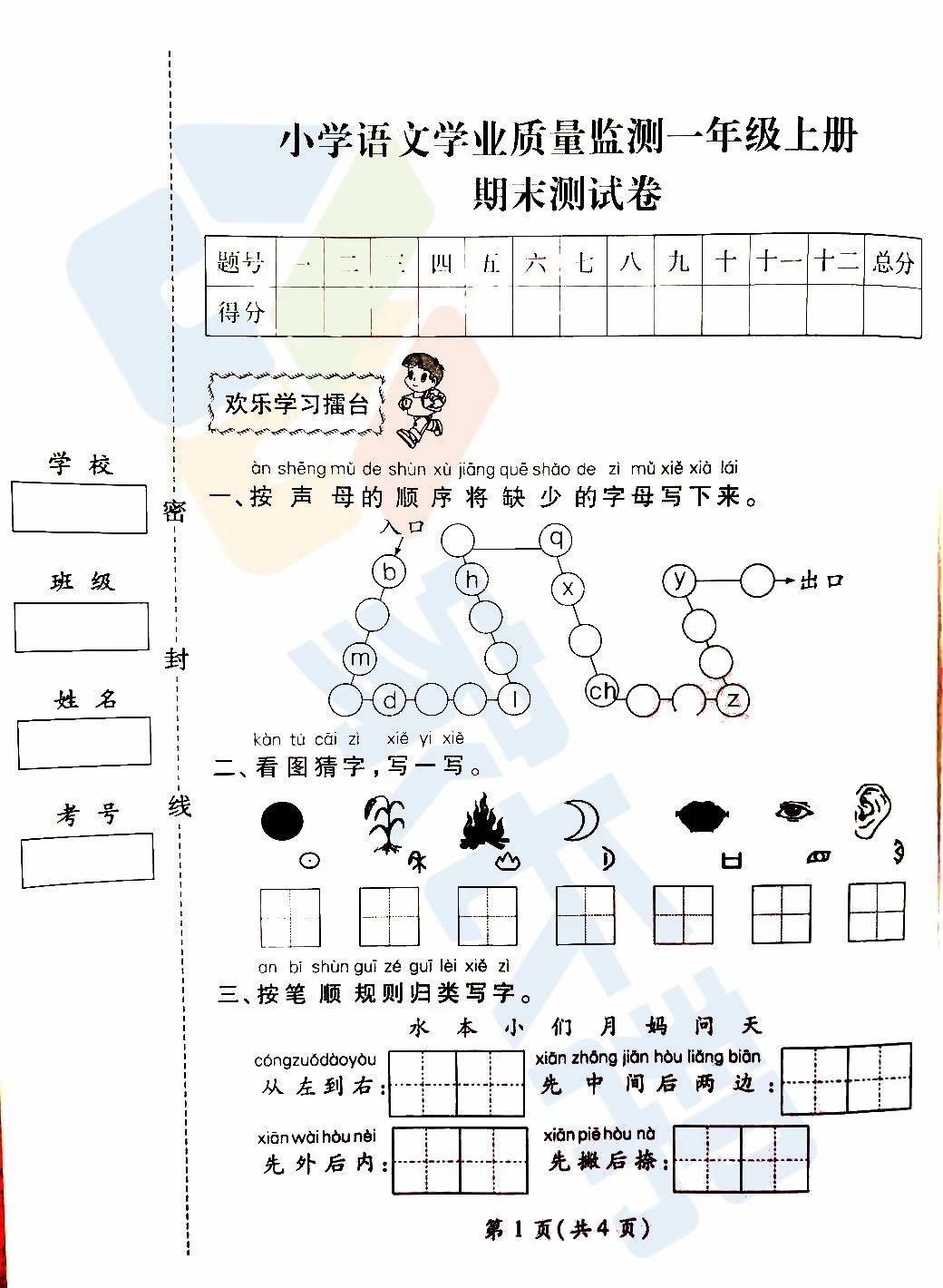 2019年武汉市江汉区小学一年级语文期末试卷(图片版)