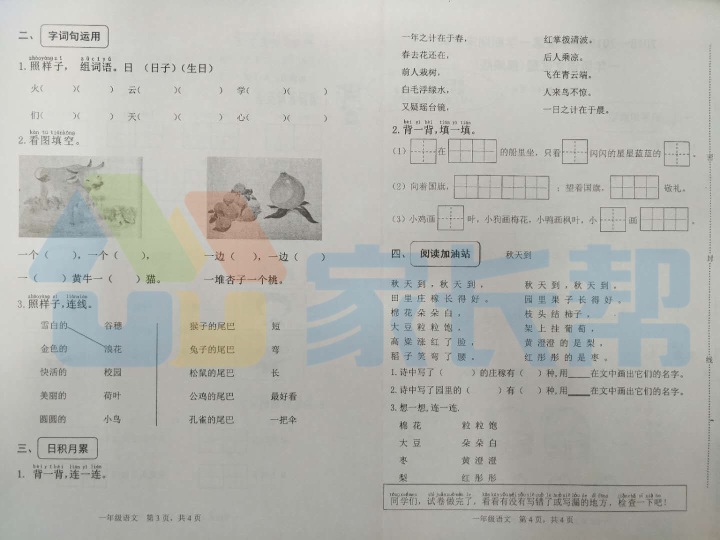 2019年武汉市洪山区小学一年级语文期末试卷(图片版)(2)