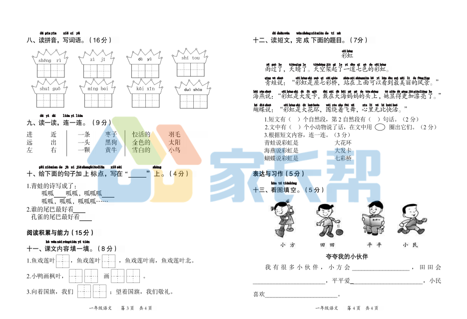 2019年武汉市东湖高新区小学一年级语文期末试卷(图片版)(2)