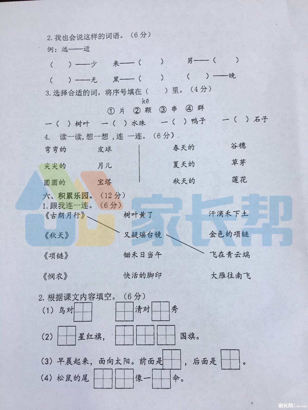 2019年武汉市硚口区小学一年级语文期末试卷(图片版)(3)