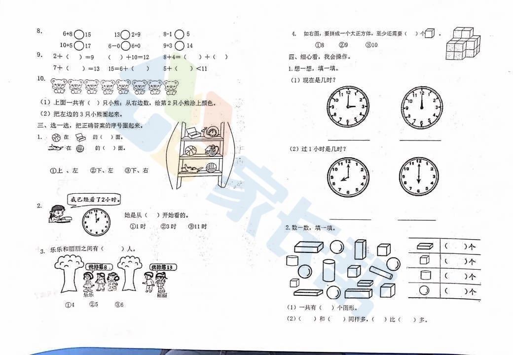 2019年武汉市硚口区小学一年级数学期末试卷(图片版)(2)