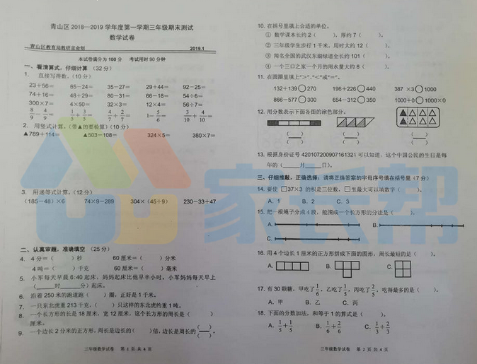 2019年武汉市青山区小学三年级数学期末试卷(图片版)
