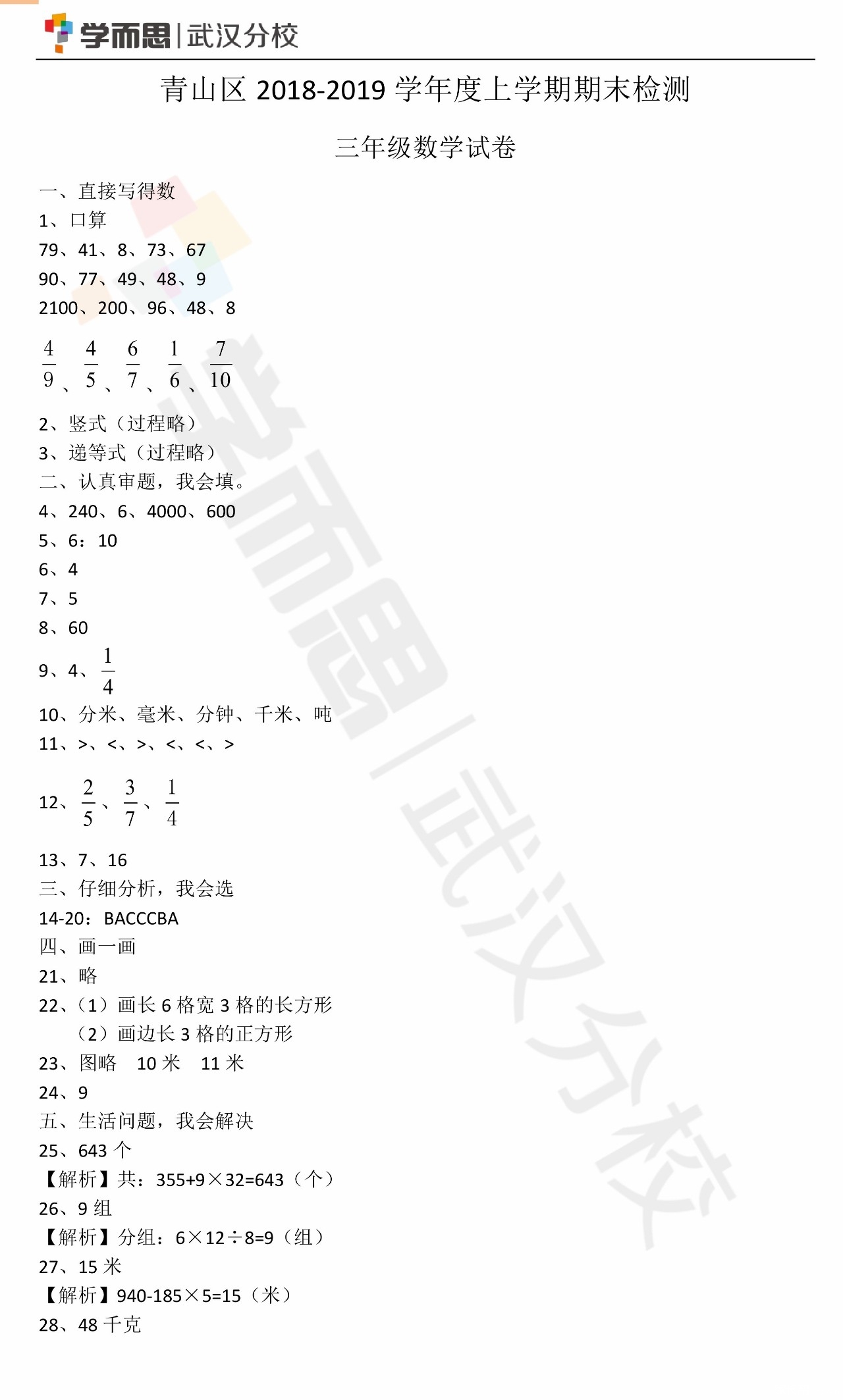 2019年武汉市青山区小学三年级数学期末试卷(图片版)(3)