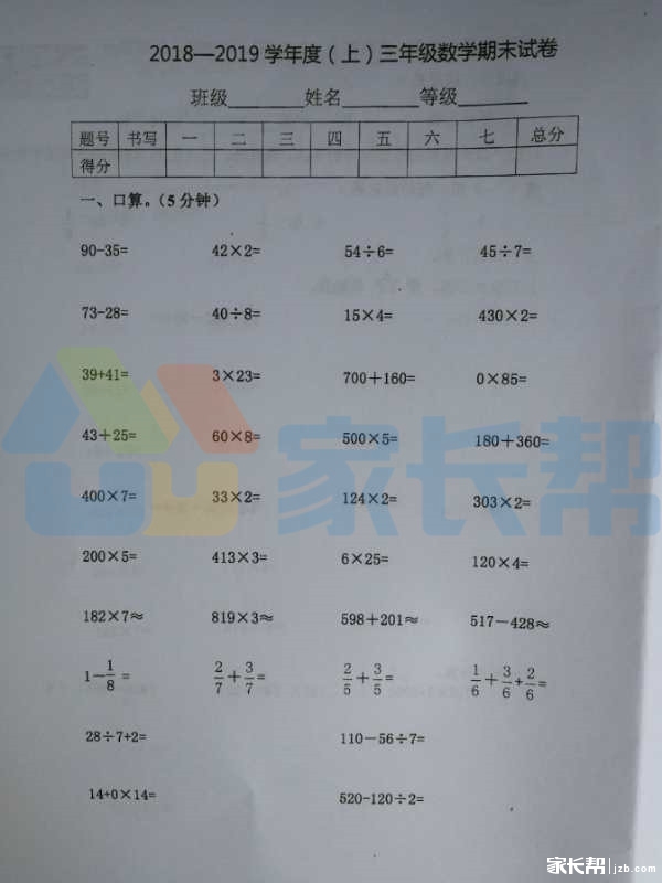 2019年武汉市硚口区小学三年级数学期末试卷(图片版)