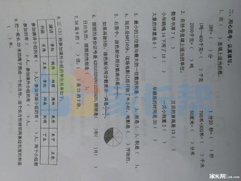 2019年武汉市硚口区小学三年级数学期末试卷(图片版)(2)