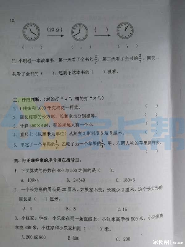 2019年武汉市硚口区小学三年级数学期末试卷(图片版)(3)