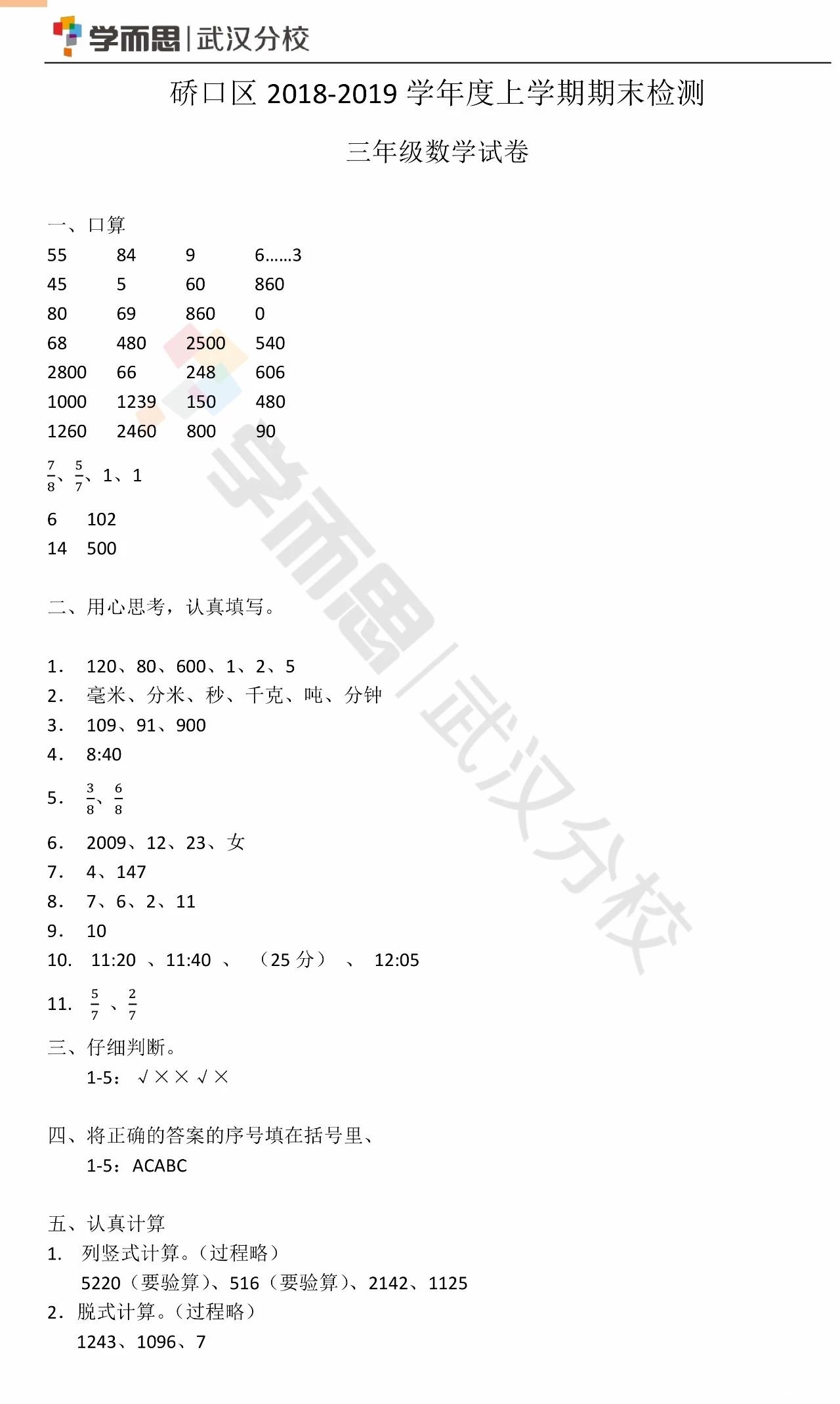 2019年武汉市硚口区小学三年级数学期末试卷(图片版)(7)