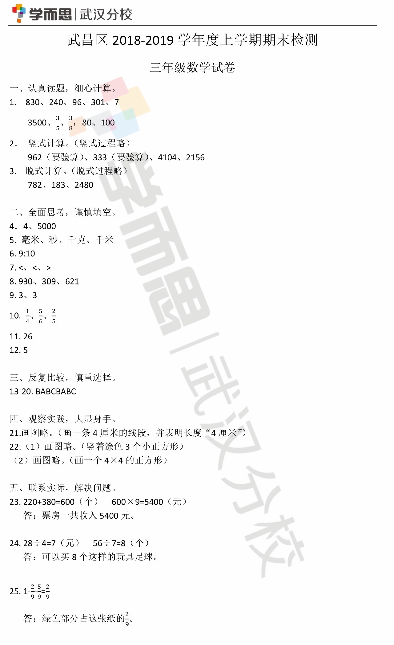 2019年武汉市武昌区小学三年级数学期末试卷(图片版)(5)