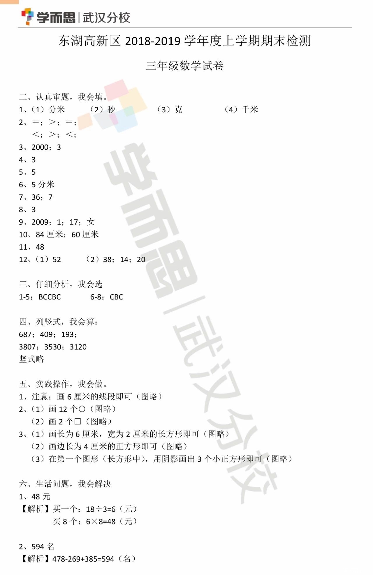 2019年武汉市东湖高新区小学三年级数学期末试卷(图片版)(5)