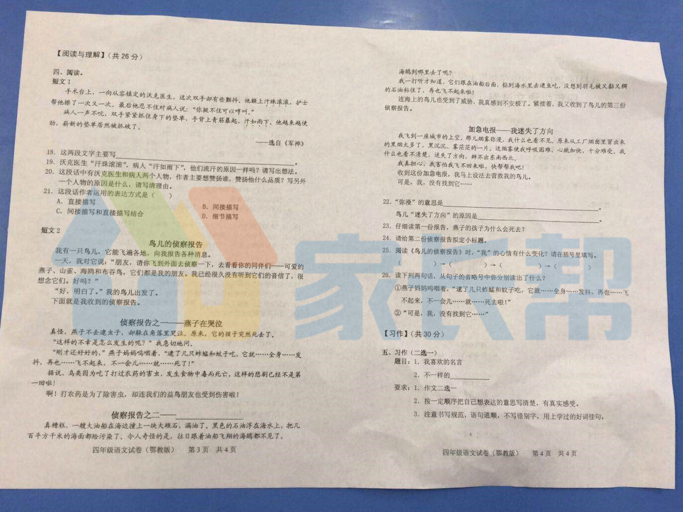 2019年武汉市武昌区小学四年级语文期末试卷(图片版)(2)
