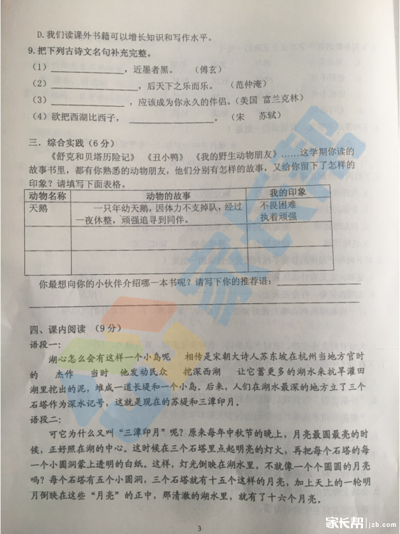2019年武汉市硚口区小学四年级语文期末试卷(图片版)(3)