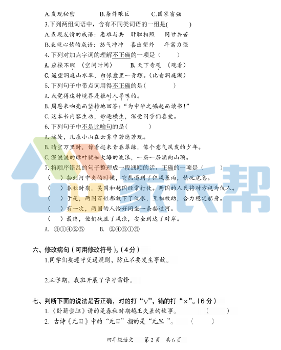 2019年武汉市东湖高新区小学四年级语文期末试卷(图片版)(2)