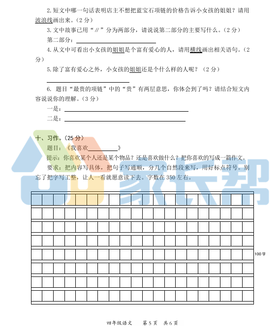 2019年武汉市东湖高新区小学四年级语文期末试卷(图片版)(5)