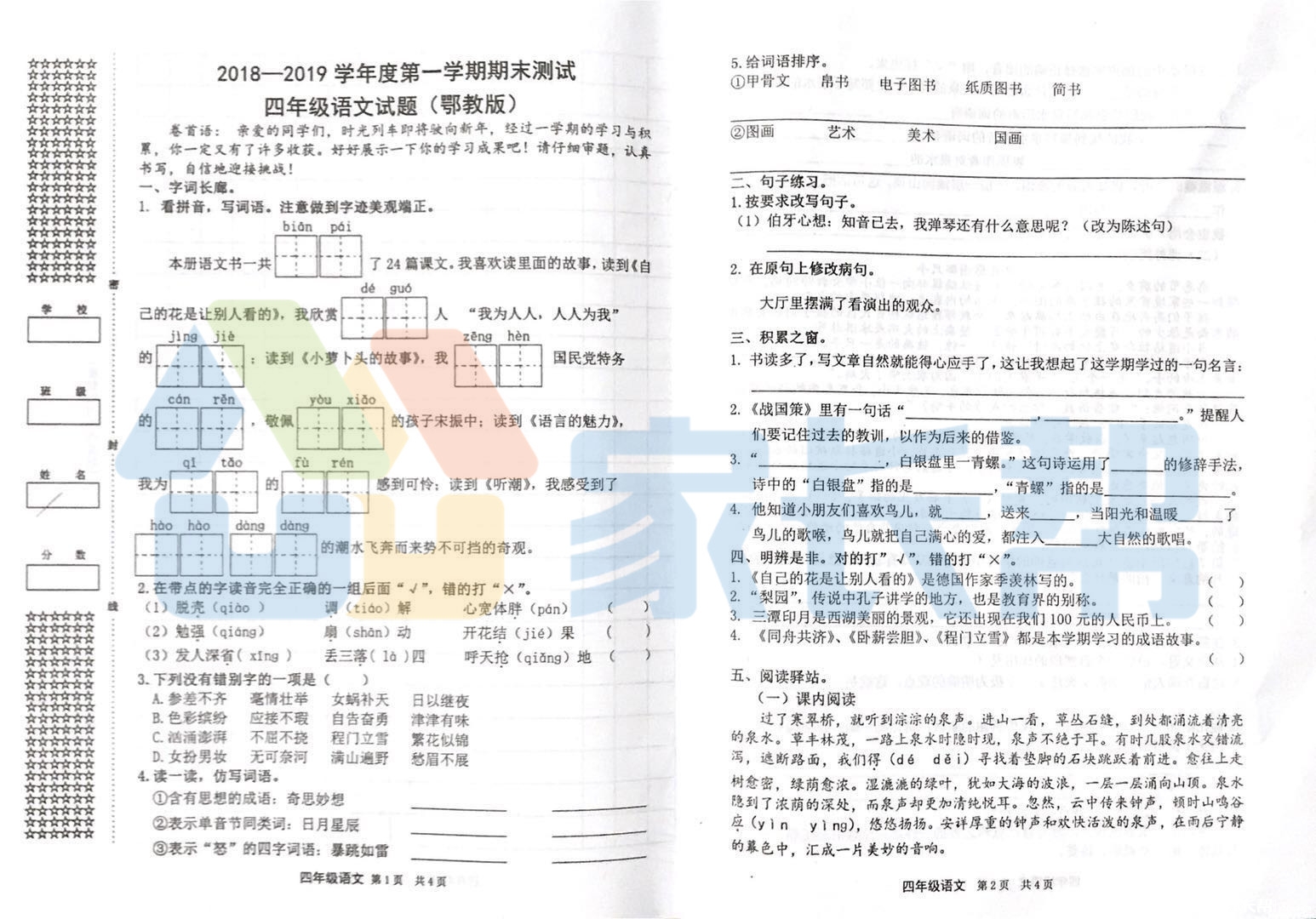 2019年武汉市洪山区小学四年级语文期末试卷(图片版)