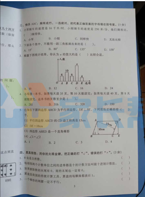 2019年武汉市江岸区小学四年级期末考试卷(图片版)(6)