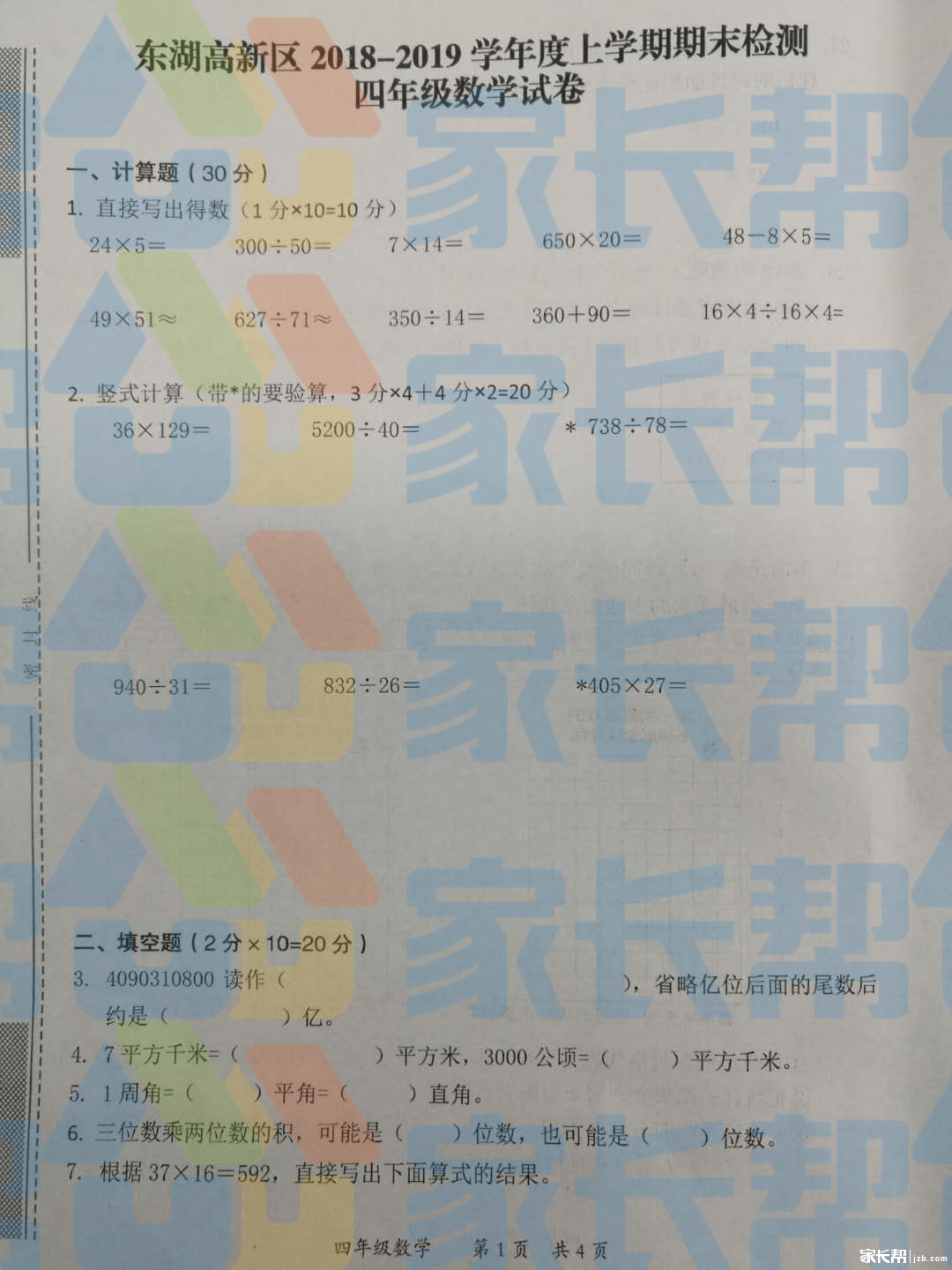 2019年武汉市东湖高新区小学四年级期末考试卷(图片版)