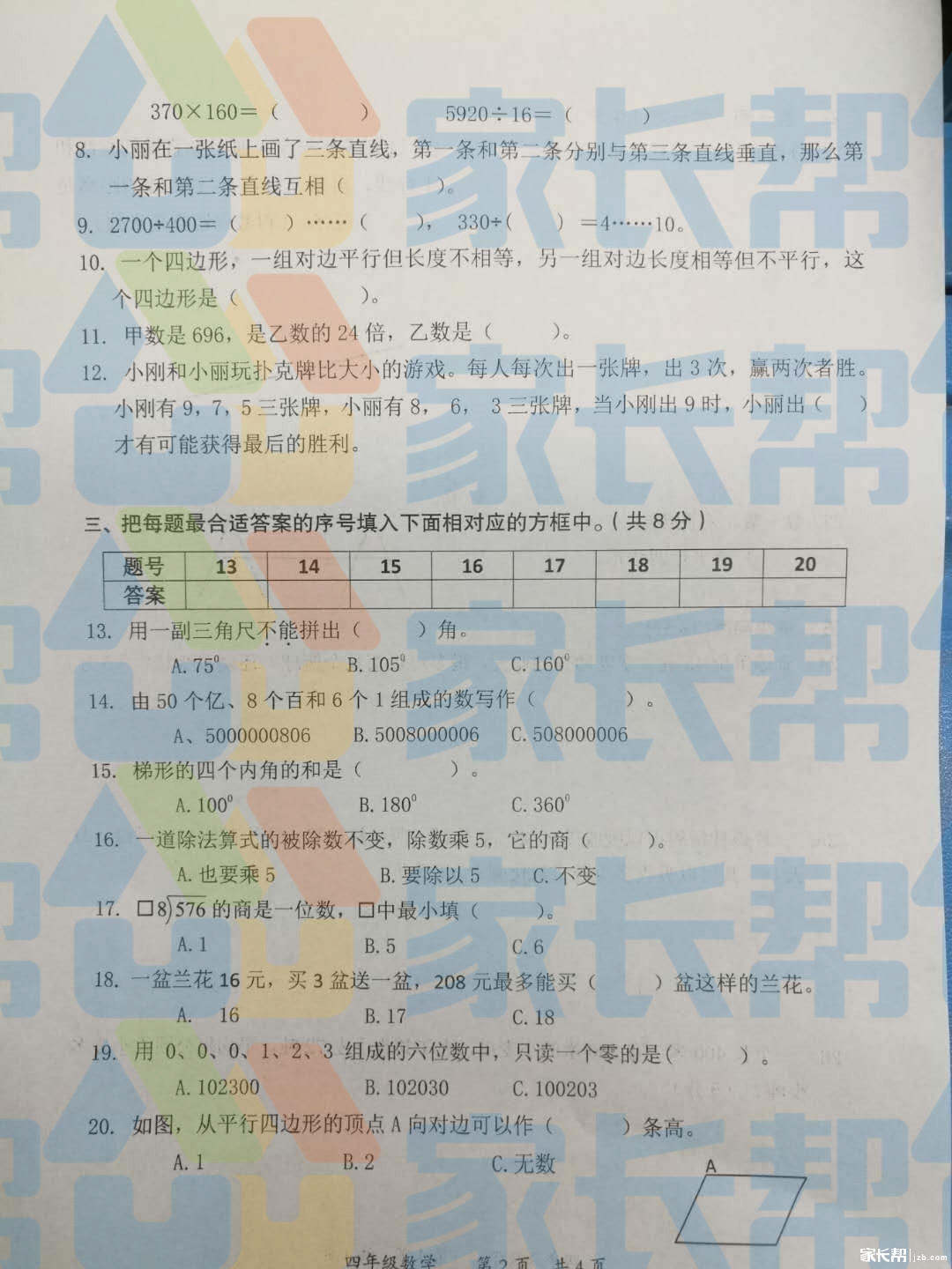 2019年武汉市东湖高新区小学四年级期末考试卷(图片版)(2)