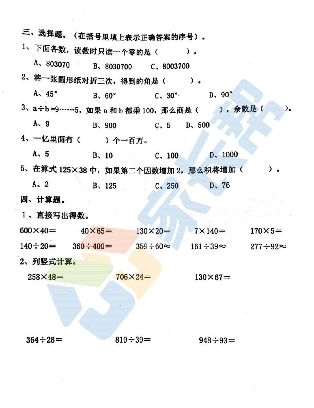 2019年武汉市洪山区小学四年级期末考试卷(图片版)(2)