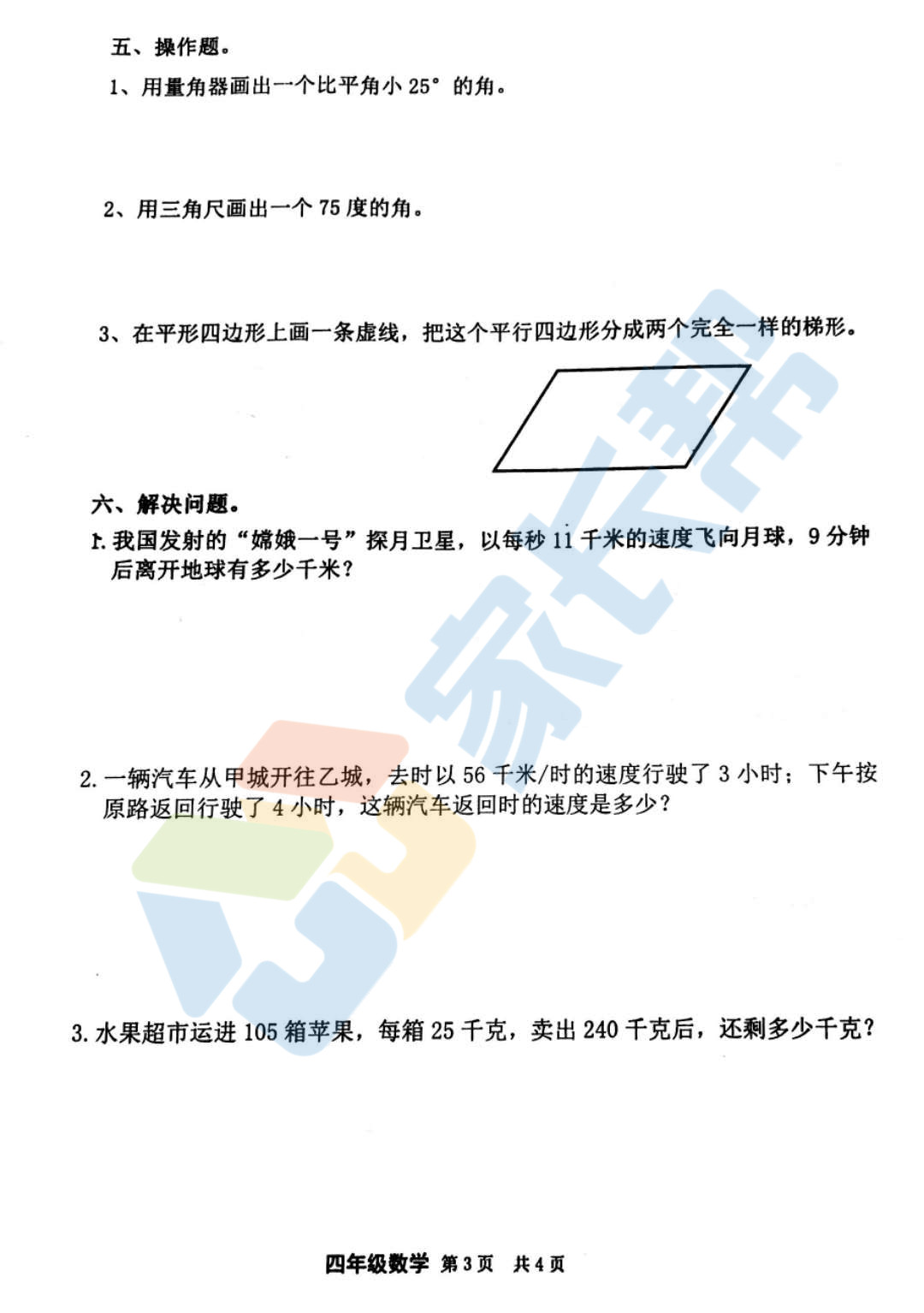 2019年武汉市洪山区小学四年级期末考试卷(图片版)(3)