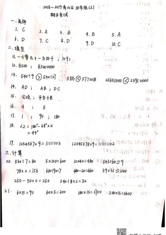 2019年武汉市青山区小学四年级期末考试卷(图片版)(5)