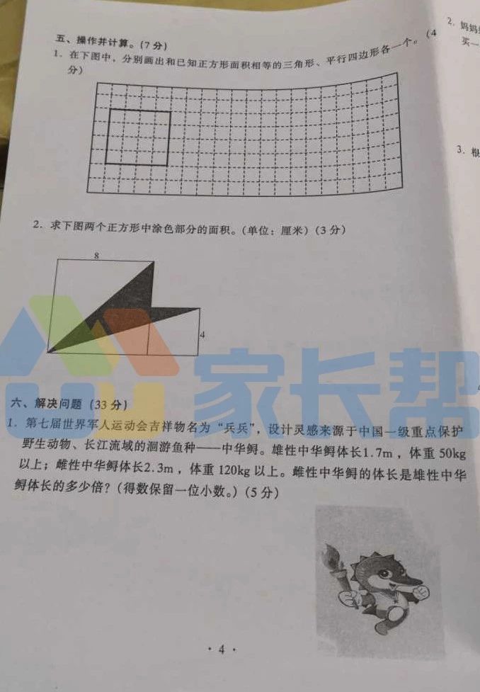 2019年武汉市江岸区小学五年级数学期末卷(图片版)(4)